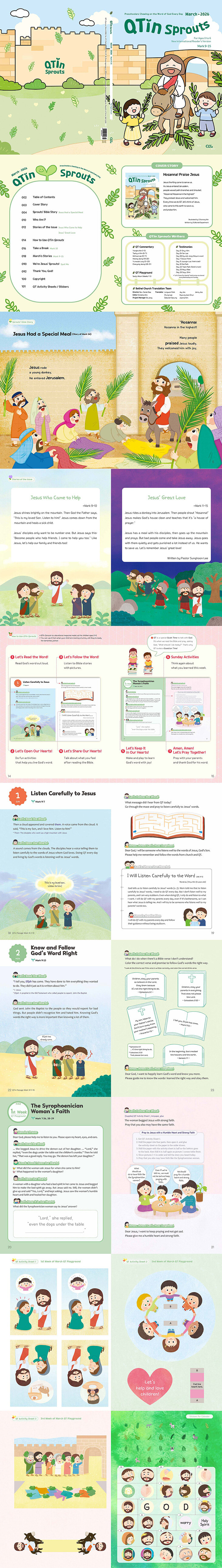 “《QTin Sprouts》, a devotional leading many souls to Jesus Christ, restoring the broken families, and reviving the churh”2016년 1월 창간된 《새싹 큐티인》은 미취학 아동을 위해 《큐티인》과 동일한 본문 중 주요 구절로 묵상, 집필된 말씀묵상지입니다.