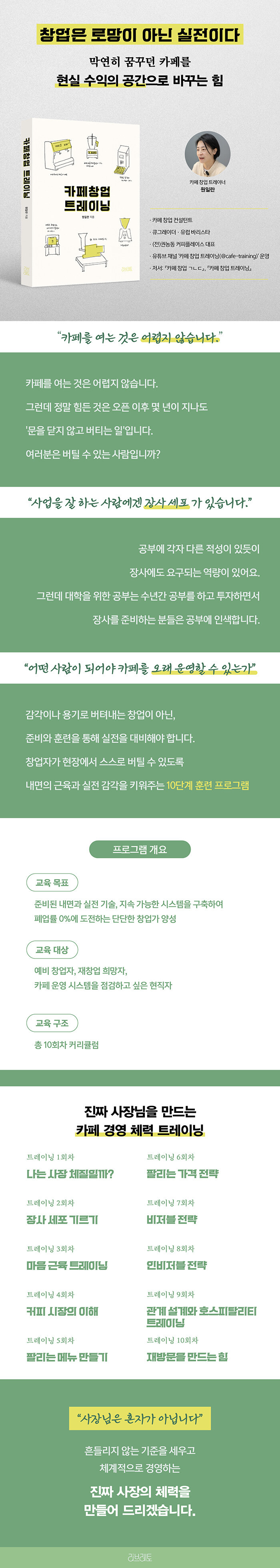 2019년 출판기획자로서 처음 만난 이후, 원일란 저자는 자신의 콘텐츠를 더욱 단단하게 다져왔다. 전작 『카페 창업 ㄱㄴㄷ』이 카페 '운영' 자체에 초점을 맞췄다면 이번 책은 카페를 창업하는 '사람'에게 초점을 맞춘다. 결국 카페를 어떤 모습으로 만들어가는지는 사장의 태도에 달려 있기 때문이다. 그 태도는 한순간에 만들어지지 않는다. 기초 체력을 길러야 하고 매일 스스로를 단련해야 한다. 『카페 창업 트레이닝』이라는 제목, 그리고 저자가 운영하는 유튜브 채널 '카페 창업 트레이너 - 원일란입니다'가 공통적으로 전하는 메시지는 명확하다.