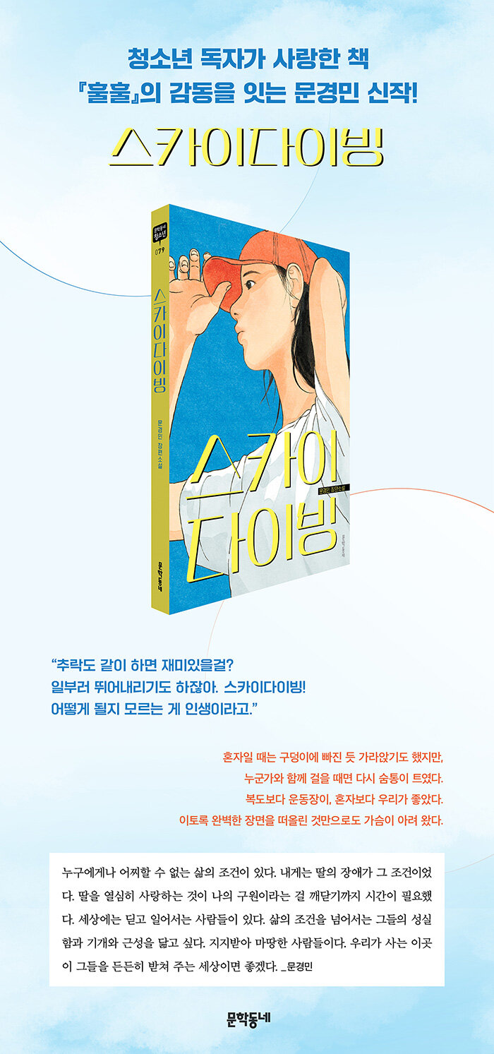 『훌훌』로 제12회 청소년문학상 대상과 제14회 권정생문학상 대상을 수상하며 청소년 독자들의 독보적인 지지와 사랑을 받아 온 문경민 작가의 신작. 『훌훌』에서 단절된 과거를 딛고 내일을 향해 나아가는 청소년의 성장을 보여 주고, 『나는 복어』를 통해 자신만의 꿈을 찾아 나서는 특성화고등학교 아이들의 생생한 일상을 그렸던 문경민 작가가 이번에는 『스카이다이빙』으로 먹먹한 감동을 전한다. 삶의 중력을 이겨내고 최선을 다해 좋은 쪽으로 내딛는 용기를 보여 주며 전작의 감동을 잇는 작품으로 다시 한번 청소년들에게 다가간다.