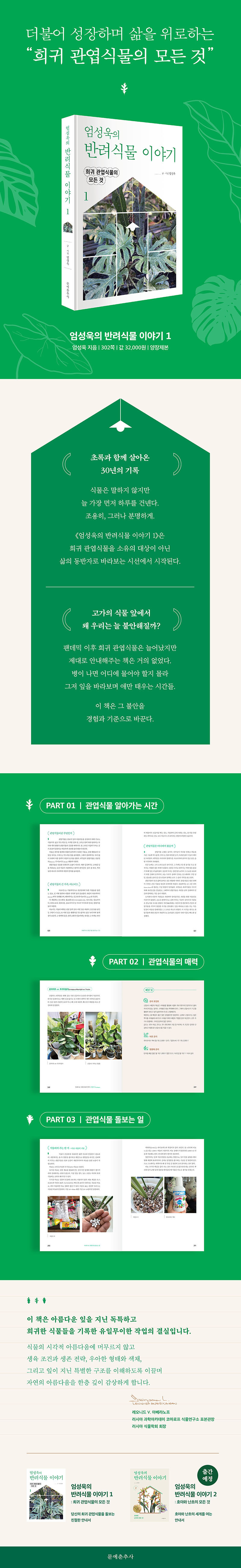중학생 때 한국춘란에 매혹된 이후 30년 넘게 난초·관엽식물·호야·죽백란·일경구화 등 수많은 반려식물과 함께 삶을 이어오고 있다. 중국과 베트남에서 26년 가까이 주재원으로 지내며 자생지의 식물들을 직접 관찰하고 수집한 경험은 그 생태와 아름다움을 온몸으로 깨닫게 해준 소중한 배움이었다.한국인 최초로 자신의 이름을 딴 동양란 계열 심비디움과 호야 신종을 국제 학술지에 정식 등록했으며 국내외 전문가들과의 폭넓은 교류를 바탕으로 다양한 식물의 신품종 개발에도 꾸준히 힘쓰고 있다. 현재 부산난연합회 부이사장으로 활동하며 난초 문화의 저변 확대에 기여하고 있다. 또한 난초 전문지 《난과 생활》에 반려식물 칼럼을 연재했으며 《희귀 관엽식물 투어》(2021), 《엄성욱의 반려식물 이야기 2》(2026)를 출간해 반려식물 문화 확산에도 앞장서고 있다.한국 중견 기업의 ESG 상무이사로서 베트남 법인에서 현지 사회에 이바지한 공로를 인정받아, 2025년 산업통상자원부 장관 표창을 받았다. 이 상은 기업과 지역사회, 나아가 국가 경제 발전에 기여한 이들에게 수여되는 국가유공자에 대한 표상으로 기업 임직원이 받을 수 있는 최고 영예로 평가된다.저자는 바쁜 직무와 해외 생활 속에서도 식물과 함께하며 배운 기쁨과 위로, 그리고 오랜 세월 쌓아온 경험을 더 많은 이들과 나누고자 이 책을 집필했다. 그의 반려식물 이야기로 독자들이 작은 숲과 같은 쉼과 영감을 얻고 자신의 일상에서도 식물과 더불어 사는 기쁨을 새롭게 발견하길 바란다.