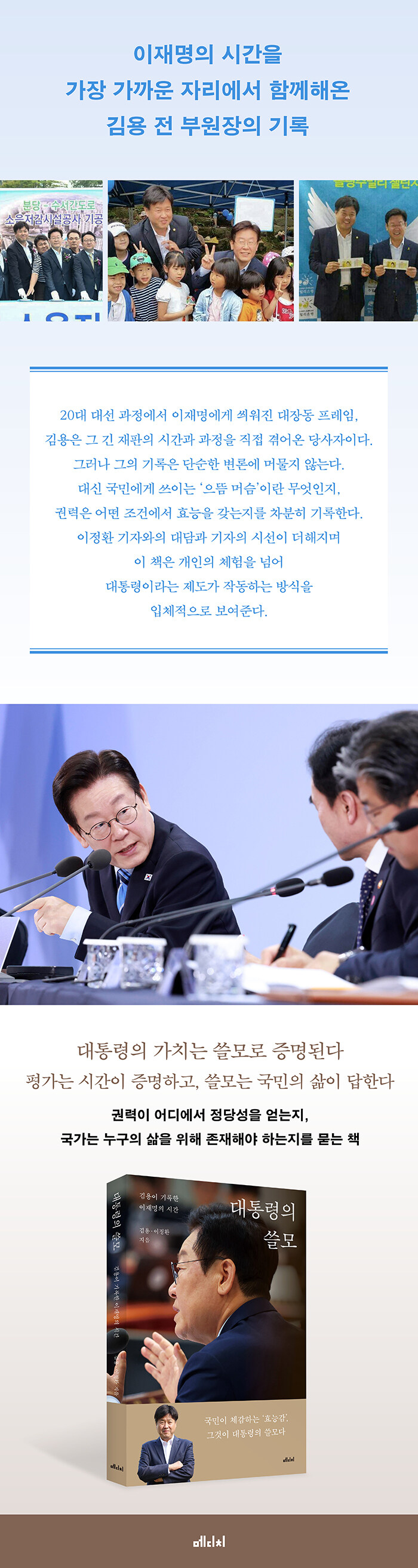 이 책은 김용이 기록한 이재명의 시간이자, 국민이 체감한 대통령의 효능에 대한 기록이다. 정치는 말이 아니라 결과로 평가받아야 한다. 대통령의 가치는 결국, 국민이 느끼는 쓸모로 증명된다.