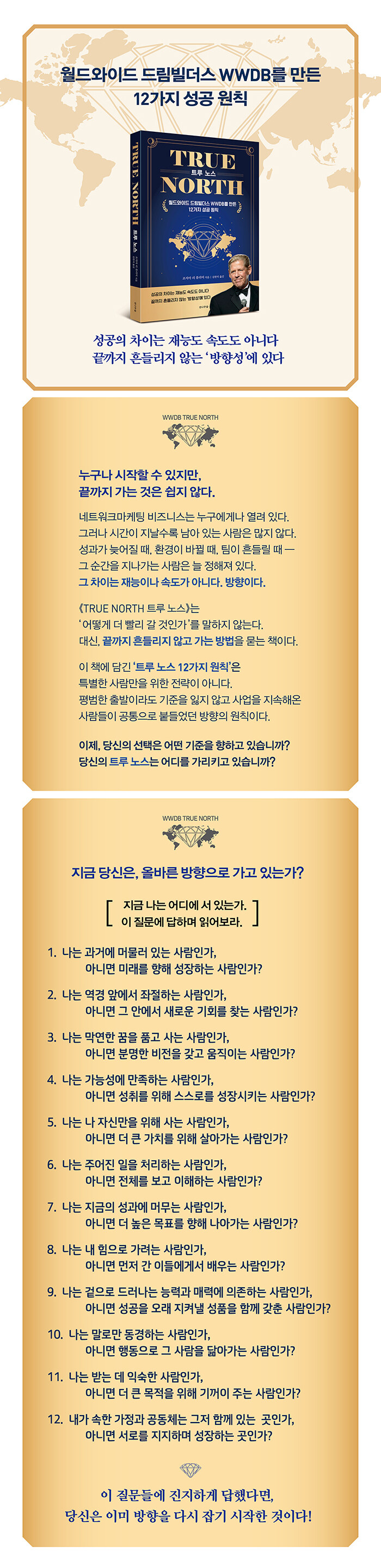 월드와이드 드림빌더스(WWDB)는 암웨이 사업자들로 구성된 글로벌 드림빌더스 조직으로, 한국을 포함해 북미와 아시아 등 여러 지역에서 다수의 사업자와 리더들이 함께 활동해온 대표적인 그룹이다. WWDB는 단기 성과나 판매 기술보다, 사람과 관계, 책임과 신뢰처럼 변하지 않는 가치와 원칙을 중심에 두고 조직 문화를 형성해왔다. 《트루 노스》는 바로 이 드림빌더스 사업자들에게 정확한 로드맵과 최선의 조언을 전하기 위해 쓰인 책으로, WWDB가 어떤 기준과 방향 위에서 성장해왔는지를 보여준다.