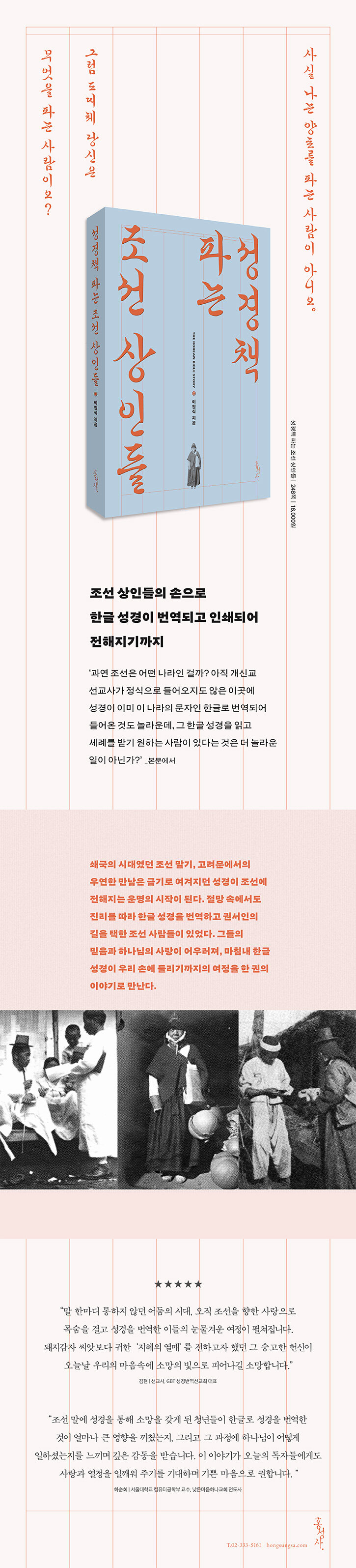 꺼지지 않는 빛으로 찾아온 성경 《성경책 파는 조선 상인들》(이원식 지음, 홍성사)은 한글 성경이 번역·인쇄되어 조선에 전해지기까지의 과정을 추적하며, 그 이면에 담긴 한국 근대사의 아픔과 신앙의 여정을 함께 조명한다. 저자는 하나님의 섭리 가운데 조선과 국외 여러 지역에서 이어진 만남과 사건들이 한글 성경 번역과 보급으로 완성되는 과정을 서사적으로 풀어낸다.
