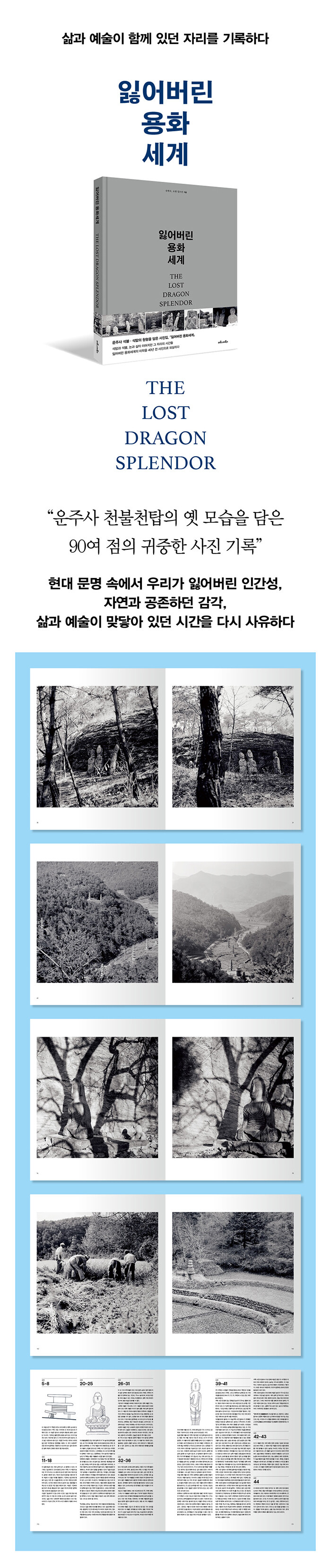 운주사는 통일신라시대에 창건된 사찰로, 천불천탑이라 불리는 수많은 석불과 석탑이 사찰과 산자락 곳곳에 흩어져 있는 것으로 유명하다. 이 석불·석탑들은 각기 다른 표정과 자세, 크기를 지니고 있는데, 저자들은 이들 석불·석탑을 서구 미학의 형식미나 조형 예술의 범주로 해석하지 않는다. 대신 그것을 논을 일구고 삶을 이어온 농부들의 노동과 신앙이 만들어낸 결과로 바라본다. 이러한 저자의 시선이 담긴, 계단식 논과 함께 존재했던 돌미륵과 석탑의 사진들은 생산과 예술, 일상과 신앙이 분리되지 않았던 시대의 감각을 보여준다. 『잃어버린 용화세계』는 예술이 삶의 현장에서 어떻게 발생하고 축적되었는지를 사진과 사유를 통해 설득력 있게 풀어낸다.