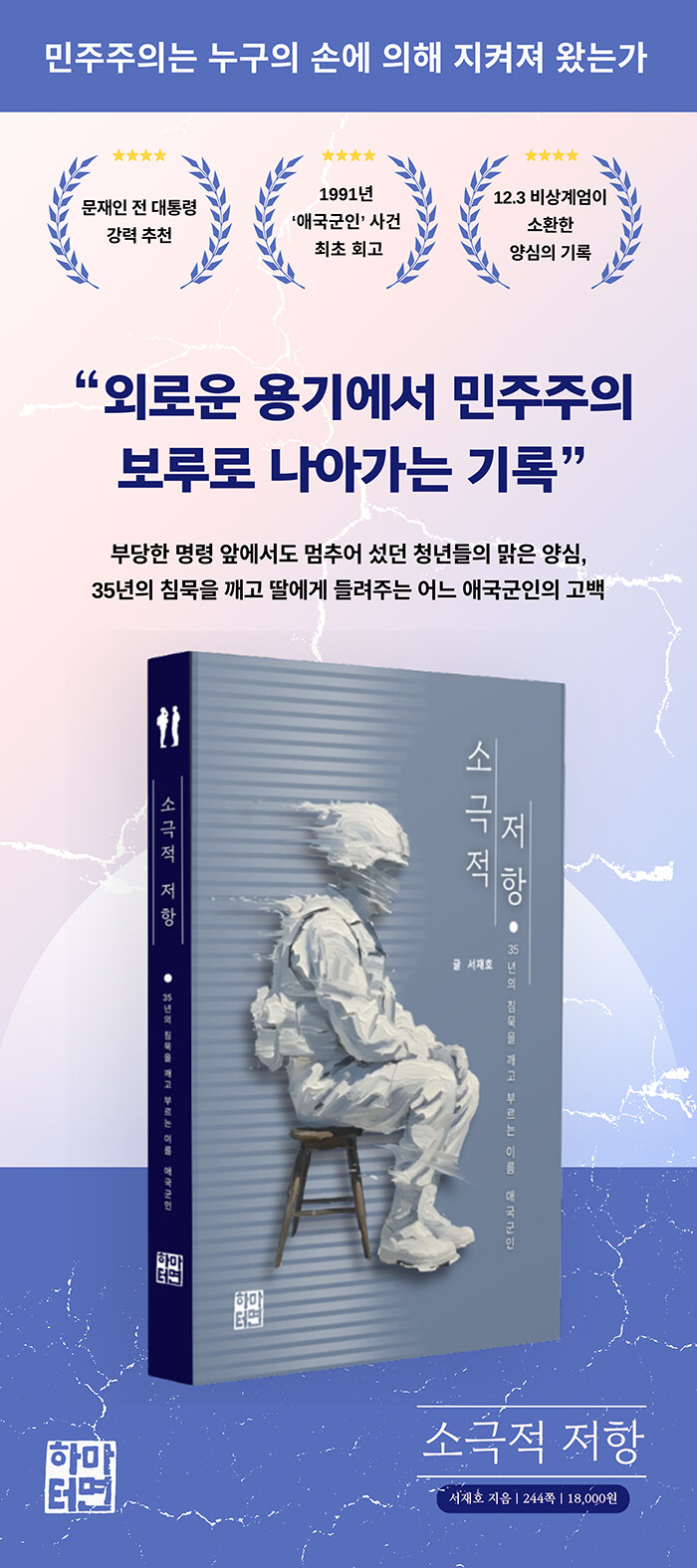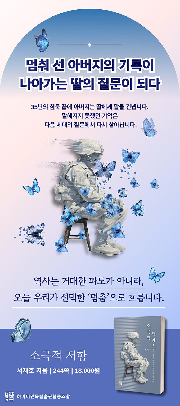 침묵으로 맞선 민주주의의 기록, 『소극적 저항』 출간하마터면독립출판협동조합은 서재호 저자의 신간 『소극적 저항』을 출간했다. 이 책은 2024년 12월 3일 비상계엄 사태를 목격한 저자가, 딸 ‘유월’과 대화를 나누며 35년 전 자신이 겪었던 ‘애국군인’사건을 회고하며 글로 옮긴 작업이다. 저자는 오랜 시간 묻어두었던 과거의 조각들을 오늘의 시선으로 다시 들여다보며, 국가 권력이 민주주의를 압박하던 순간들 속에서 ‘양심에 어긋나는 길을 가지 않겠다’고 마음먹었던 청년들의 이야기를 담담하게 그려낸다.
