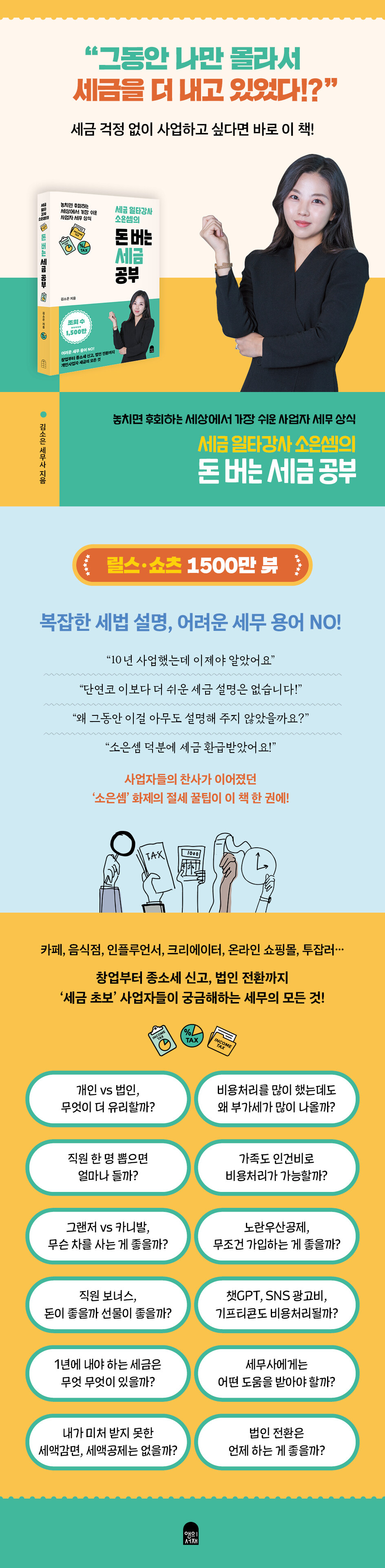 에이블세무회계 대표. 대학에서 통계학을 전공하고 회계학을 복수 전공했다. 졸업 후 기업 회계 팀에서 실무 경험을 쌓던 중 전문 자격의 필요성을 절감하고 주경야독으로 세무사 공부를 시작했으며, 2015년 세무사 시험에 합격했다. 세무사가 된 뒤, 부자들은 지식을 돈으로 사기 때문에 버는 돈 대비 오히려 세금을 적게 낸다는 사실을 깨달았다. 정보의 불평등이 세금의 불평등으로 이어지는 현실에서, 세금 때문에 고통받는 사업자들이 없게 그들을 돕는 사람이 되겠다고 결심한다. 2016년 세무사사무소를 개업한 후, 10여 년간 수천 명의 사업자들과 함께하며 현장에서 생생한 세금 고민을 접했다. 이를 바탕으로 세금 때문에 어려움을 겪는 사업자들을 위해, 2024년부터 어렵고 복잡한 세금 정보를 알기 쉽게 설명한 세무 콘텐츠를 제작해 유튜브와 인스타그램에 올리기 시작했다. 1년 만에 1,500만 뷰를 달성하며 ‘세금 인플루언서’로 화제를 모았다. 이 외에도 사업자 대상 세금 강의 등 다양한 활동을 통해 보다 많은 사람들이 세금 정보를 쉽게 접할 수 있도록 돕고 있다. 이 책은 현장에서 만난 사업자들의 실제 고민과 그 답을 담은 첫 번째 결과물이다.