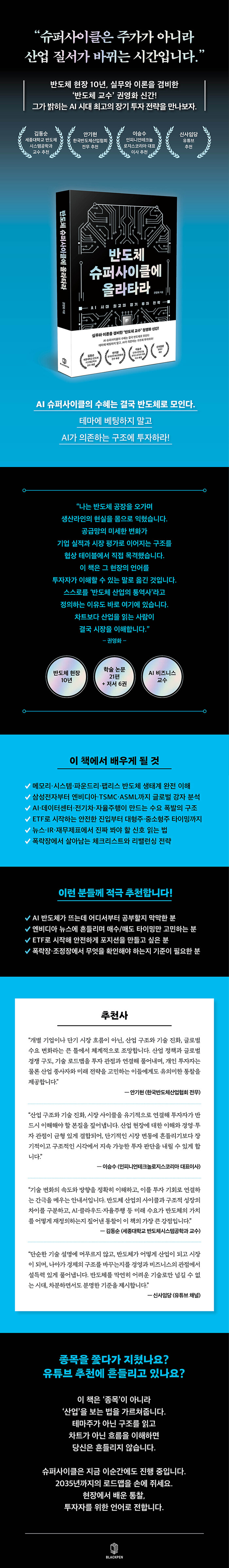 반도체 현장에서 10년을 보낸 뒤 투자자의 시선으로 산업을 바라보게 된 연구자이자 교육자다. 일본 반도체 기업에서 기술영업과 글로벌 비즈니스를 담당하며 산업의 최전선을 경험했다. 삼성전자, SK하이닉스, TSMC 등 주요 반도체 기업들과 협업하며 협상 테이블에 참여했고, 수차례 반도체 공장을 오가며 생산라인의 현실을 몸으로 익혔다. 이 과정에서 공급망의 미세한 변화가 기업 실적과 시장 평가로 이어지는 구조를 현장에서 직접 목격했다.이후 경영학 박사 학위를 취득하고 반도체 기업을 주제로 한 학문적 연구를 병행했으며, 현재는 대학에서 AI 비즈니스를 가르치고 있다. 학술 논문 21편과 저서 6권을 집필했지만, 저자가 가장 중요하게 여기는 것은 언제나 ‘현장의 언어’다. 방송, 강연, 칼럼을 통해 복잡한 반도체 산업과 기술을 투자자가 이해할 수 있는 말로 풀어내는 데 집중해왔다.저자는 스스로를 ‘반도체 산업의 통역사’라 정의한다. 현장에서 보고 배운 것을 투자자의 언어로 번역하고, 기술의 논리를 산업과 수익의 구조로 연결하는 것이 자신의 역할이라고 믿는다. 10년의 현장 경험과 이후의 연구·투자 과정에서 얻은 결론은 분명하다. 차트보다 산업을 읽는 사람이 결국 시장을 이해한다는 것이다.