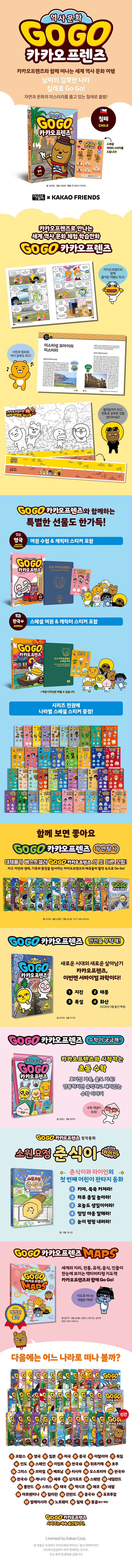한국인이 가장 사랑하는 캐릭터 ‘카카오프렌즈’와 함께 떠나는 세계 역사 문화 여행!누적 판매 200만 부를 돌파한 베스트셀러 <Go Go 카카오프렌즈> 시리즈를 향한 독자들의 관심과 사랑은 여전하다. <마법천자문>으로 학습만화 시장을 연 아울북과 카카오프렌즈가 만나 탄생시킨 이 시리즈에서 카카오프렌즈 캐릭터들은 여행 내내 각자의 귀엽고 사랑스러운 매력으로 활약한다. <Go Go 카카오프렌즈> 시리즈는 역사를 지키키 위해 카카오프렌즈가 시간여행을 떠나며 펼쳐지는 이야기로 독자들은 카카오프렌즈와 함께 세계 곳곳의 다양한 역사와 문화를 경험한다. 깜찍한 캐릭터들과 재미있는 스토리는 물론, 알찬 정보까지 놓치지 않은 <Go Go 카카오프렌즈> 시리즈는 폭넓은 독자층을 자랑하며 출간되자마자 베스트셀러에 올라 꾸준한 사랑을 받고 있다.