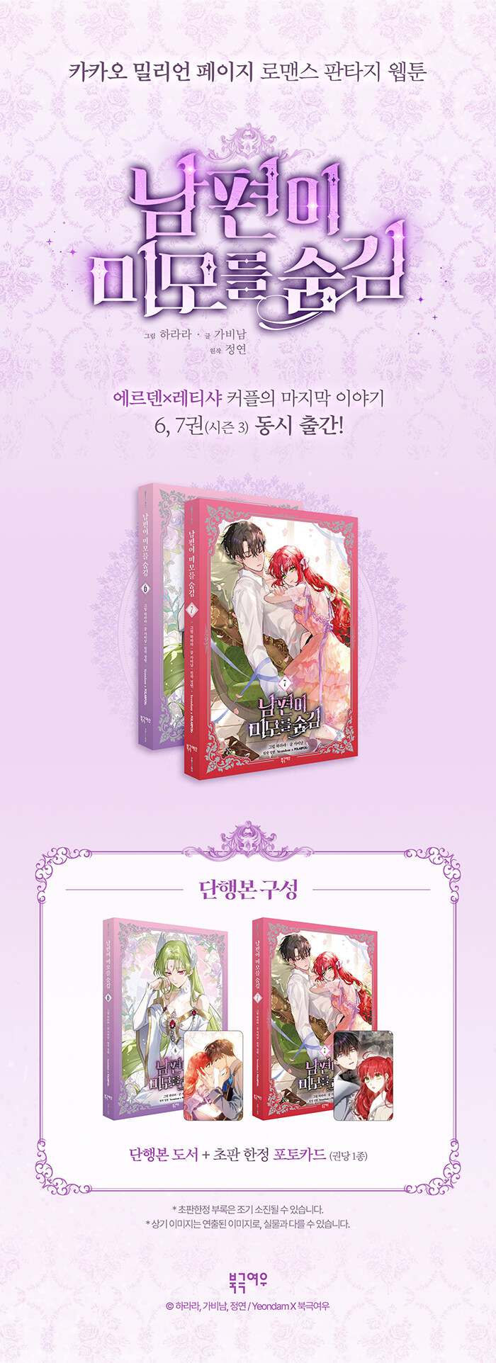 『남편이 미모를 숨김』 6, 7권(시즌 3, 완결) 단행본 동시 출간카카오페이지와 카카오웹툰에서 동시 서비스되며, 합계 누적 조회수 8,600만을 기록한 밀리언 페이지 로맨스판타지 웹툰 『남편이 미모를 숨김』 시즌 3이 단행본으로 출간되었다. 완결 이후로도 꾸준히 독자들의 사랑을 받아온 『남편이 미모를 숨김』은 『반월당의 기묘한 이야기』, 『황제궁 옆 마로니에 농장』 등 인기 웹소설을 다수 출간한 정연 작가의 원작 소설을 바탕으로, 유명 일러스트레이터 하라라 작가의 그림과 가비남 작가의 각색을 거쳐 탄생한 웹툰이다.