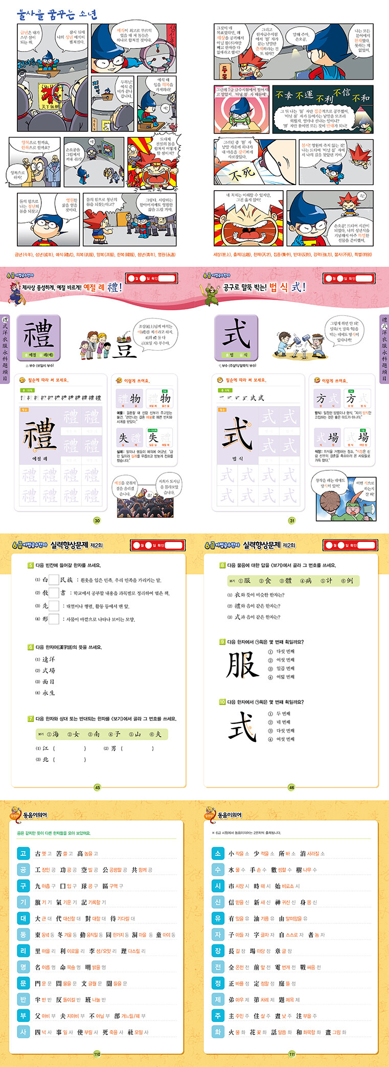 주제별로 묶어 놓은 낱자들을 재미있는 단컷 만화와 한자의 이미지와 음과 훈이 절로 연상되는 주문을 통해 익힐 수 있습니다. 음과 훈, 획순, 부수, 낱말 등을 재미있게 익힌 후에 쓰기 연습을 해 보는 코너입니다.
