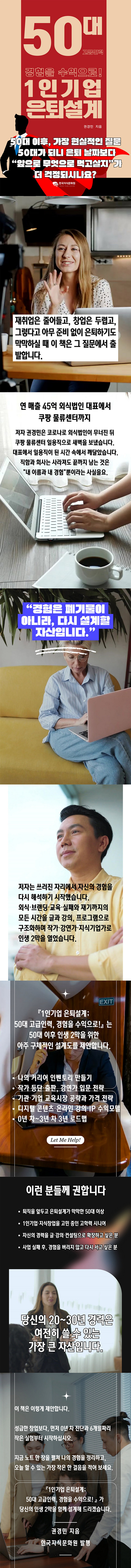 저자는 코로나 팬데믹으로 인한 사업 실패와 함께 삶의 기반이 무너지면서 쿠팡 물류센터 일용직으로 일하던 시기를 거쳐, 자신의 경력과 실패를 처음부터 다시 해석하는 인생 2막을 설계했다. 이 과정에서 “경험은 폐기되는 것이 아니라 다시 설계되는 자산”이라는 관점을 세우고, 글과 강의, 프로그램을 결합한 1인 지식기업가의 길을 선택했다.현재 한국지식문화원 대표이자 KCN뉴스 발행인으로, 출판 기획과 강사 양성, 인문학 교육과 은퇴설계 프로그램을 운영하고 있다. 특히 맥주를 역사·문화·도시 문명과 연결한 「맥주 인문학」을 비롯해 「미식 인문학」, 「도시 인문학」, 중·장년층을 위한 은퇴·생애전환 강의 등으로 공공기관·기업·대학에서 폭넓게 활동하고 있다.권경민 교수는 스위스 Cesar Ritz에서 관광경영학, 미국 University of Utah에서 교육학 석사를 취득했다. 오랜 기간 인문학 대중화와 문화 연구에 힘써왔다. 경찰대학, KAIST 인문학 외래교수, 문화체육관광부 인문학 자문위원 등 인문학자로서 다양한 활동 중인 베스트셀러 작가다.국무총리실, 감사원, 경희대, 삼성경제연구소, 포스코, LG전자, 한국은행 등 다양한 기관과 기업에서 1,500회 이상 강연을 진행하고 있다. SBS뉴스토리, MBC다큐프라임, jtbc뉴스, KBS뉴스 등 국내외 방송에 60회 이상 출연했다.특히, 그의 강의는 단순한 지식 전달이 아니라, 삶과 문화의 감각을 회복시키는 인문학적 체험으로 평가받는다. 그는 맥주를 통해 도시를 읽고, 문화를 통해 인간을 이해하는 “감각의 인문학자”로 불린다.지금까지 17권의 단독 저서를 집필하며 브랜딩·마케팅·콘텐츠 비즈니스의 전 과정을 직접 실험해 온 그는, 이론이 아닌 ‘몸으로 검증한 경험’을 기반으로 50대 이후의 작가·강연가·1인기업 모델을 제시하고 있다.