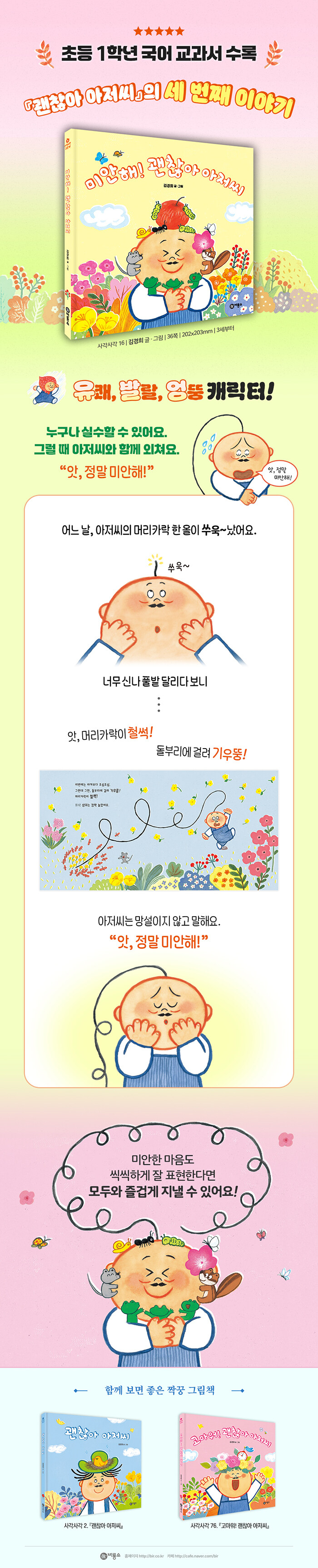 유쾌, 발랄, 엉뚱 캐릭터! 초등 1학년 국어 교과서 수록 『괜찮아 아저씨』 세 번째 이야기 누구나 실수할 수 있어요. 그럴 때 아저씨와 함께 외쳐요. “앗, 정말 미안해!”긍정의 힘을 실어 주는 밝고 흥겨운 그림책『괜찮아 아저씨』의 후속작『미안해! 괜찮아 아저씨』가 ㈜비룡소에서 출간되었다. 어떤 일이 닥쳐도“오, 괜찮은데?”를 반복하면서 초긍정 캐릭터의 힘을 선보였던『괜찮아 아저씨』는 유아뿐만 아니라 초등, 성인 독자까지 아우르며 폭넓은 독자층의 호응을 얻어 10만 부 이상이 팔렸다. 특히 2022년 최신 개정 초등 1학년 국어 교과서에 수록되어 더 많은 어ㅋ이들에게 사랑받고 있으며, 두 번째 이야기『고마워! 괜찮아 아저씨』에서는 감사의 가치, 이번 신간『미안해! 괜찮아 아저씨』에서는 미안해라고 말할 수 있는 용기와 수용의 태도에 대해 알려 준다.
