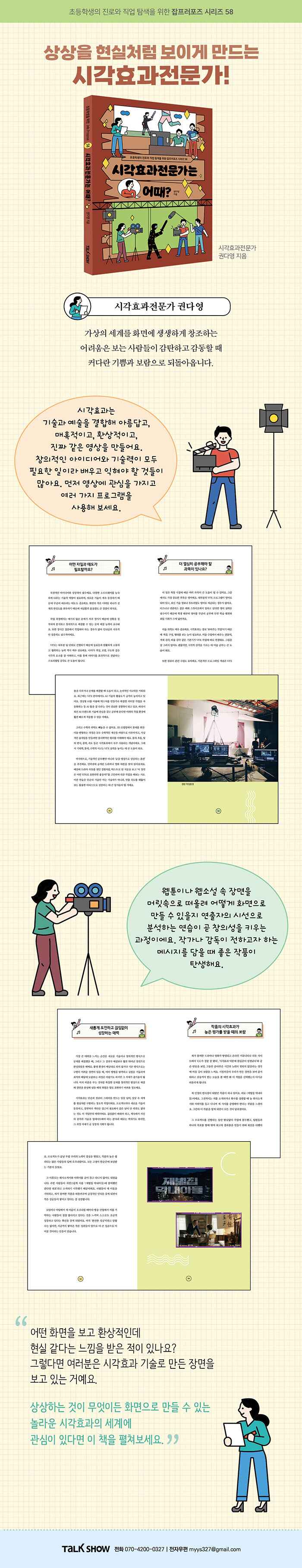 아무리 재미있는 판타지 소설이라도 영화나 드라마로 나오면 실망하던 시절이 있었어요. 그런데 요즘은 어떤가요? 세상에 없는 환상의 세계로 꽉 채운 화면이 사람들의 눈과 마음을 사로잡아요. 살아 움직이는 것 같아 만져보고 싶은 것도 있고, 저런 건물이, 저런 나무가 진짜 있을 것 같아 찾아가고 싶은 마음도 들어요. 그만큼 시각효과의 기술이 발전했다는 뜻이에요. 상상하는 것이 무엇이든 현실로 만들 수 있는 시각효과의 놀라운 세계로 여러분을 초대합니다.