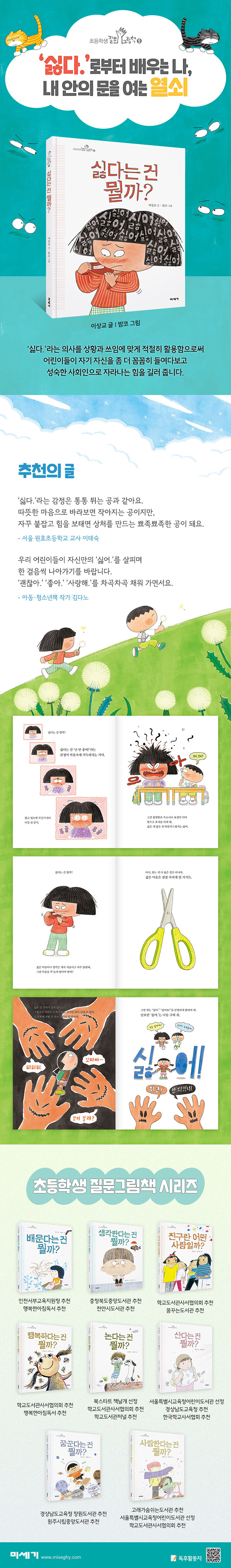 최강 콤비 이상교, 밤코 작가가 펼쳐 내는 마음 돌보기의 유쾌한 여정이상교 작가가 조목조목 풀어 낸 ‘싫다.’에 관한 풍성한 생각 거리는 그림을 그린 밤코 작가가 통통 튀면서도 재기 발랄한 그림을 더해 강력한 재미를 선사한다. ‘싫다.’의 추상적이고 강렬한 이미지를 만화 컷을 활용한 상황 묘사와 감각적인 컬러로 다채롭고 선명하게 보여준다. 이로써 독자들은 ‘싫다’는 감정을 나쁘기만 한 것이 아니라, 자기 마음을 구체적으로 들여다보고 자신 있게 표현하는 에너지로 받아들이게 된다.