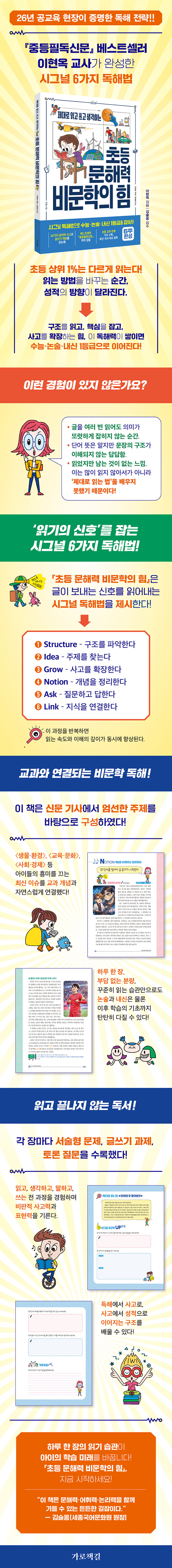 Structure, Idea, Grow, Notion, Ask, Link의 여섯 단계 전략으로 글의 신호를 체계적으로 분석한다. 구조 파악과 주제 찾기에서 사고 확장과 지식 연결까지 이어지는 과정 속에서 문해력·어휘력·논리력·메타인지가 함께 자라도록 설계했다. 반복 훈련을 통해 읽는 속도와 정확성을 동시에 끌어올린다.