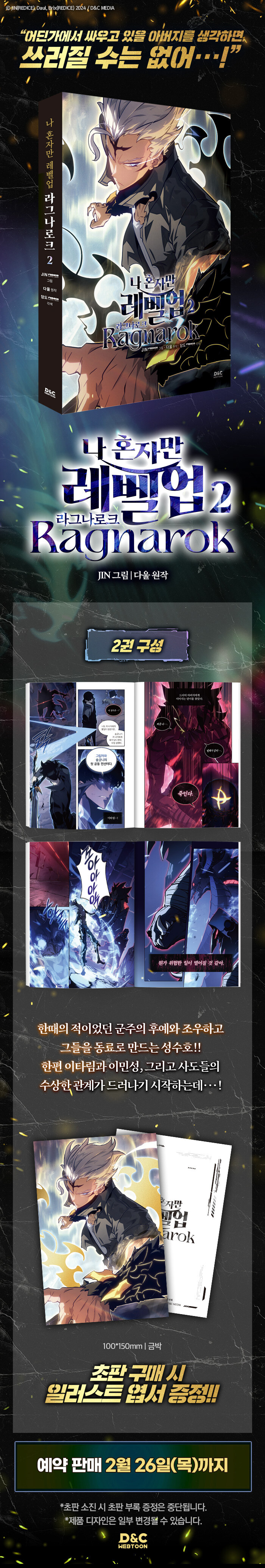 「나 혼자만 레벨업」 스핀오프 출간!!레벨업은 아직 끝나지 않았다!! 누적 조회수 5.7억 뷰, 폭발적 인기 속에 연재를 마친 「만화 나 혼자만 레벨업」, 그 스핀오프 작품인 「만화 나 혼자만 레벨업: 라그나로크」가 단행본으로 출간된다. 「만화 나 혼자만 레벨업: 라그나로크」는 그림자 군주 ‘성진우’의 뒤를 이어 끝없는 레벨업을 펼치는 아들 ‘성수호’의 서사를 화려한 액션과 흥미진진한 스토리로 담아냈다. 단행본은 스펙터클한 연출을 100% 담아낼 수 있도록 판형에 맞게 전면 재편집되었으며, 윤문을 통해 한층 더 매끄러워진 대사 또한 만나볼 수 있다.