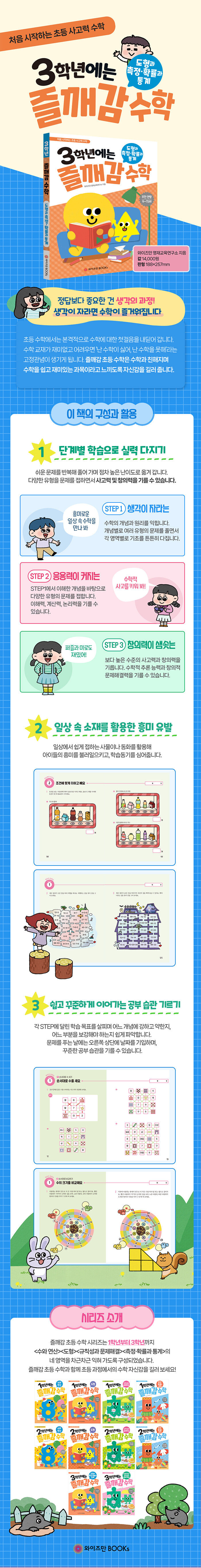 ‘즐깨감 수학’은 ‘즐거움, 깨달음, 감동 수학’의 의미를 담아, 연산 법칙이나 공식을 암기하는 방식이 아니라 생활 속 상황, 퍼즐, 게임 등 다양한 소재를 활용해 사고력 중심 학습을 제시한다. 3학년 시리즈는 아이의 발달 수준에 따라 권별 1-2개월 분량으로 학습할 수 있으며, 하루 2쪽 또는 1스텝 학습이 가능하도록 구성하였다. 《수와 연산》 《도형》 《규칙성과 문제해결》《측정·확률과 통계》영역을 균형 있게 다루고, 문제 해결 과정과 사고의 논리성을 중시하도록 안내한다.
