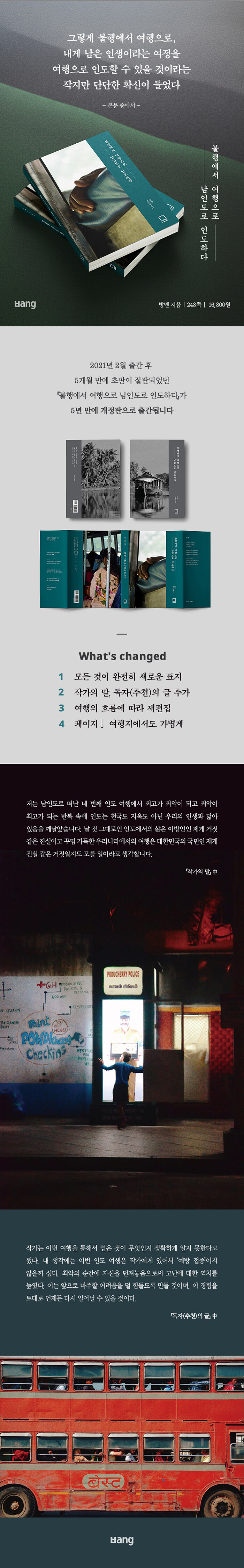 2021년 2월 출간 후 5개월 만에 초판이 절판되었던 『불행에서 여행으로 남인도로 인도하다』가 5년 만에 개정판으로 출간된다. 남인도의 뭄바이에서 만났던 강렬한 빨간 버스를 볼드하게 표현했던 초판의 표지에서 2026년에 새롭게 만나보실 수 있는 표지는 푸두체리로 이동하는 버스 안에서 만난 손을 중심으로 전개했다.
