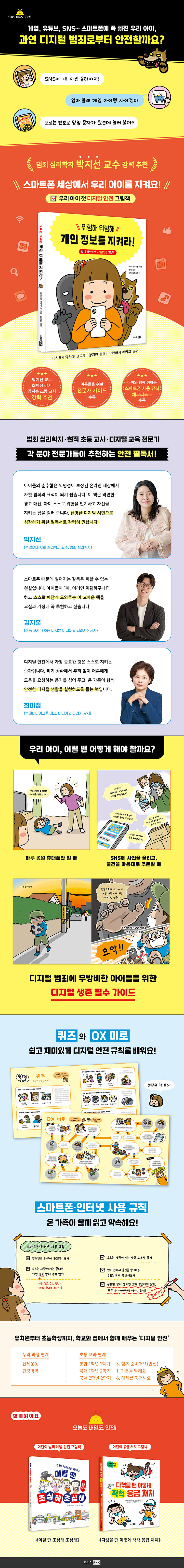 일본 디지털 안전 교육 전문가 다카하시 아키코의 감수와 그림책 작가 이시즈마 와카메의 그림이 만났다. 한국어판에는 국내 법률과 연구를 반영한 해설과 ‘양육자를 위한 전문가 가이드’를 수록했다. 디지털 범죄 예방을 가정과 학교 교육 현장에서 함께 다룰 수 있도록 기획된 안전 그림책 시리즈 「오늘도 내일도, 안전!」의 한 권이다.