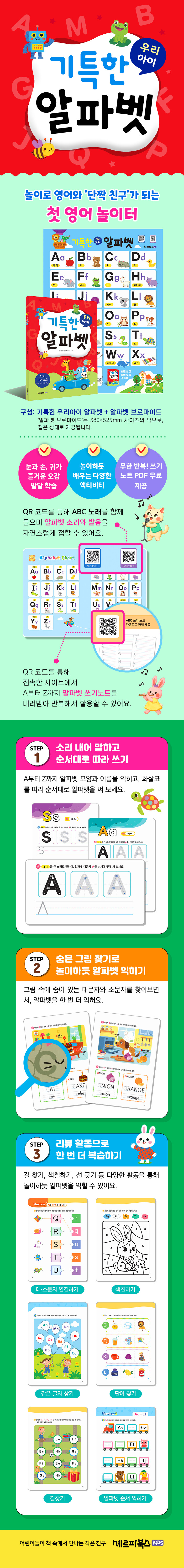 청각·시각·운동 감각을 함께 활용하는 통합 학습 구조로 설계되었다. 책에는 ABC 노래를 들을 수 있는 QR이 제공되어 아이가 노래를 따라 부르며 알파벳의 소리를 자연스럽게 익힐 수 있다. 또한 대문자·소문자 쓰기노트를 무료로 다운로드할 수 있는 QR을 제공해 가정에서도 반복 연습이 가능하다. 처음 영어를 접하는 아이에게 부담 없이 시작할 수 있는 기초 알파벳 교재이다.