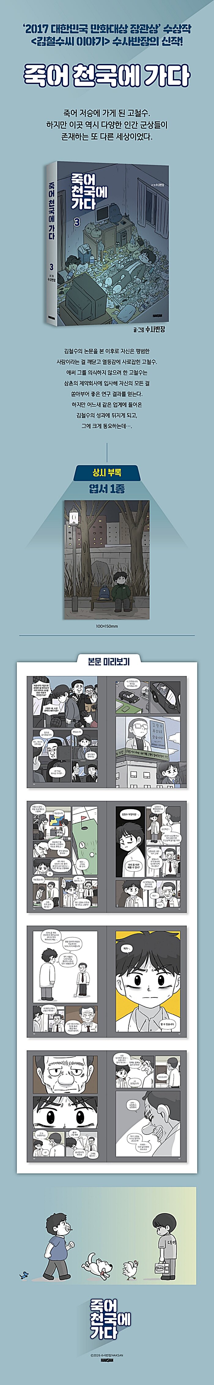 생을 마감한 주인공 고철수가 저승으로 가며 이야기가 시작되는 이 작품 <죽어 저승에 가다>는 이승과 크게 다르지 않은 다를 바 없는 다양한 인간 군상이 존재하는 사후세계를 그리고 있다. 다양한 욕망을 가지고 있는 사람들과 욕심도 미련도 없는 담담한 고철수의 태도가 대비되어 이 독특한 설정을 더욱 돋보이게 한다. 죽음과 존재의 의미라는 무거운 소재를 고철수의 삶을 통해 흡입력 있는 스토리로 풀어가며, 독자로 하여금 철학적인 사고를 하게끔 유도하면서도 재미 또한 놓치지 않아 큰 호응을 얻고 있는 작품이다.