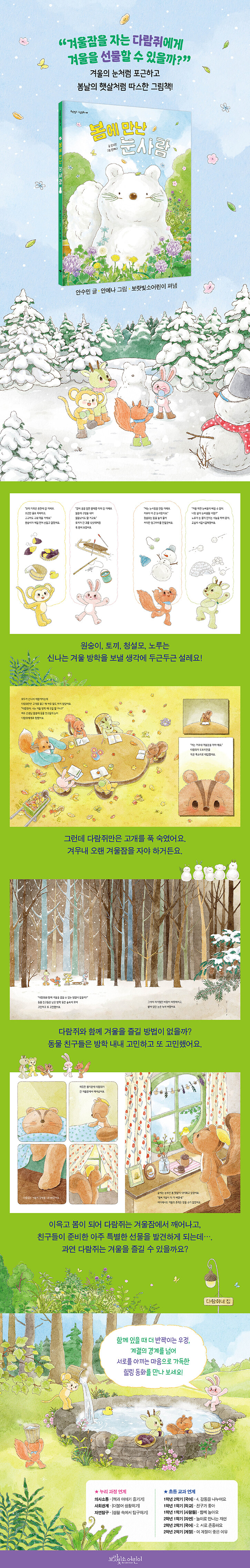 “눈과 입이 즐거운 봄날의 겨울 놀이!”긴 겨울잠에서 깨어나 동물학교로 돌아온 다람쥐가 가장 먼저 목격한 것은 흰 눈이 잔뜩 쌓인 교실 안이었어요. 봄날의 햇살이 내리쬐어도 녹지 않는 눈사람, 달콤해서 자꾸만 입에 넣고 싶은 눈뭉치, 김이 모락모락 나는 옹달샘 등 동물 친구들의 기발한 아이디어가 다람쥐를 겨울로 데려다줍니다.