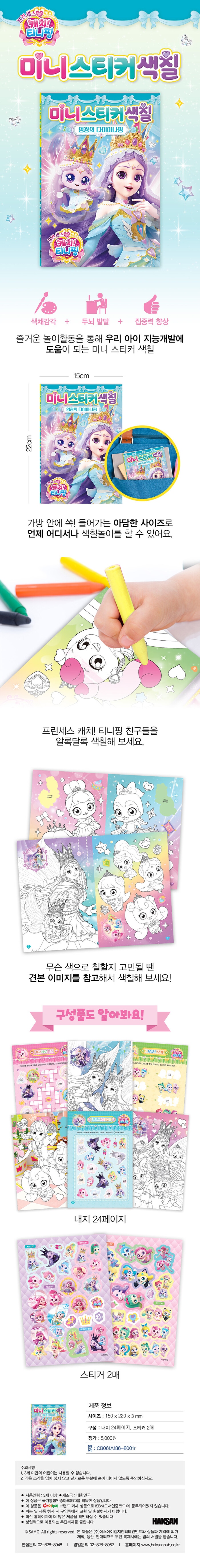 아이들에게 인기만점 스티커색칠놀이가 귀여운 미니 사이즈로! 색칠, 스티커 놀이와 재미있는 게임을 통해 아이들의 지능을 향상시키는 IQ, EQ개발 프로그램이다. 페이지마다 좋아하는 캐릭터를 칠하면서 소근육 활동이 늘어나 집중력과 창의력이 발달된다.