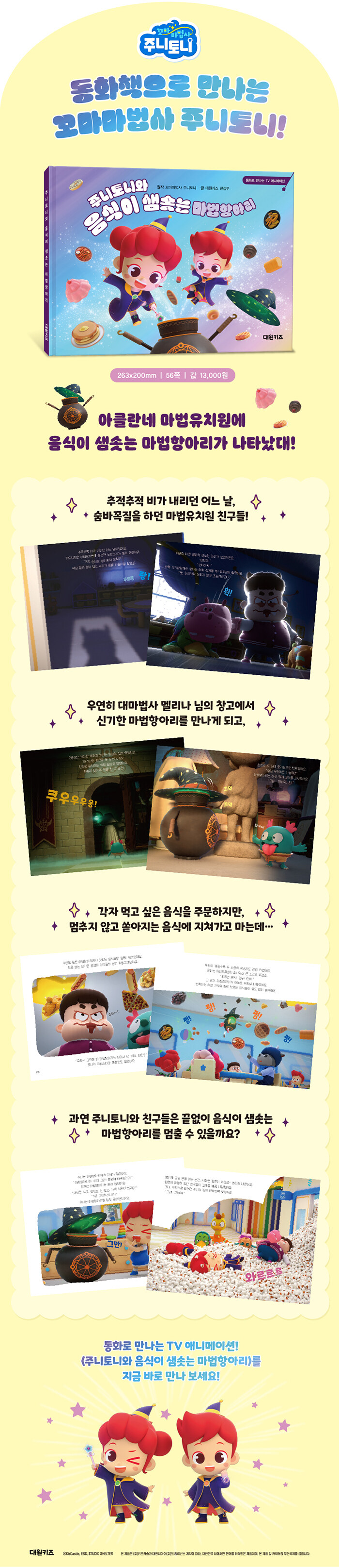 꼬마마법사 주니토니가 나섰다!TV 애니메이션 <꼬마마법사 주니토니>를 동화로 만나 보세요! 실제 애니메이션 화면과 캐릭터들의 대사를 그대로 담아, 읽기에 익숙하지 않은 어린이들도 쉽고 재미있게 즐길 수 있어요. 주니토니의 신나는 모험을 따라가다 보면, 자연스럽게 읽기 능력과 어휘력이 쑥쑥! 마법을 배우며 조금씩 성장해 가는 주니토니와 친구들의 모습을 통해 협동, 배려, 용기 등 소중한 가치도 배울 수 있답니다. 따뜻한 감성과 상상력이 가득한 <주니토니 스토리북>과 함께 TV 애니메이션 <꼬마마법사 주니토니>를 새롭게 즐겨 보세요!