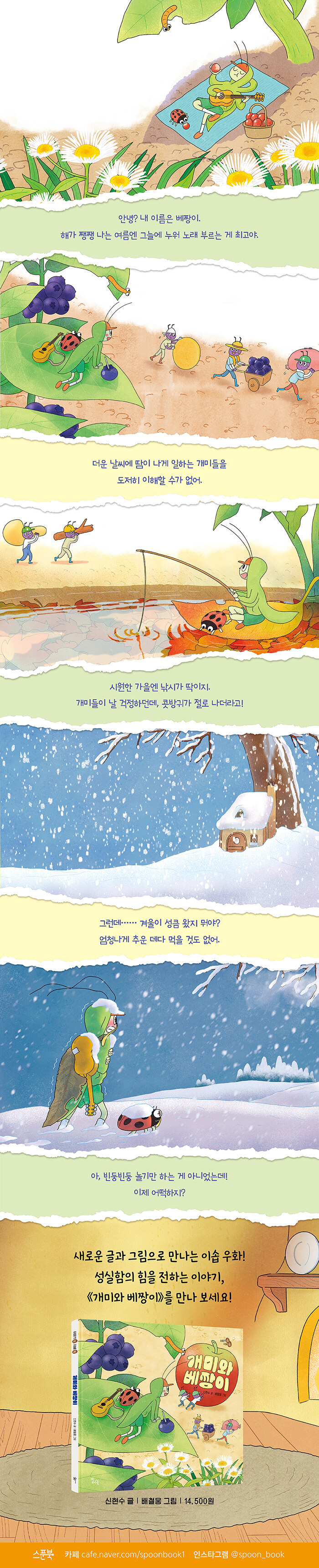 : 이솝 우화로 만나는 성실함의 힘 옛이야기 그림책은 이제 막 글을 떼고 책을 읽기 시작하는 어린이들이 만나는 첫 이야기가 되곤 합니다. 영유아 어린이들에게 첫 번째 책 읽기가 긍정적일 수 있도록 도와주어요. 옛이야기 중에서도 이솝 우화들은 쉽고 재미있는 내용과 간결한 구성, 교훈적인 결말로 이루어져 영유아 어린이들이 읽기에 좋지요. 스푼북의 브랜드 ‘하루놀’의 옛이야기 그림책 시리즈 〈이야기 속 지혜 쏙〉에서, 2026년에 이솝 우화의 《개미와 베짱이》를 새롭게 선보입니다.