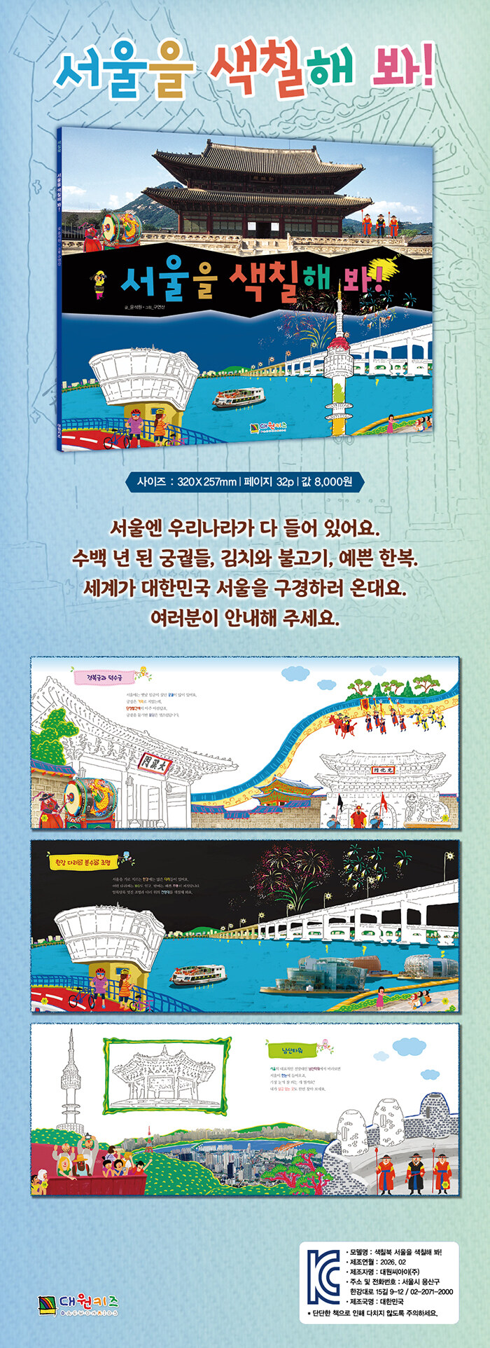 세계인이 찾는 인기 도시 서울. 서울은 과거와 현재, 미래가 공존하는 세계에서 보기 드문 도시이다. 다양한 K-컬처 문화를 품고 있고, 맛있는 음식에 친절한 시민까지…. 세계를 사로잡은 서울의 모습을 하나씩 색칠해가면서 서울에 대한 새로운 모습을 발견할 수 있을 것이다.