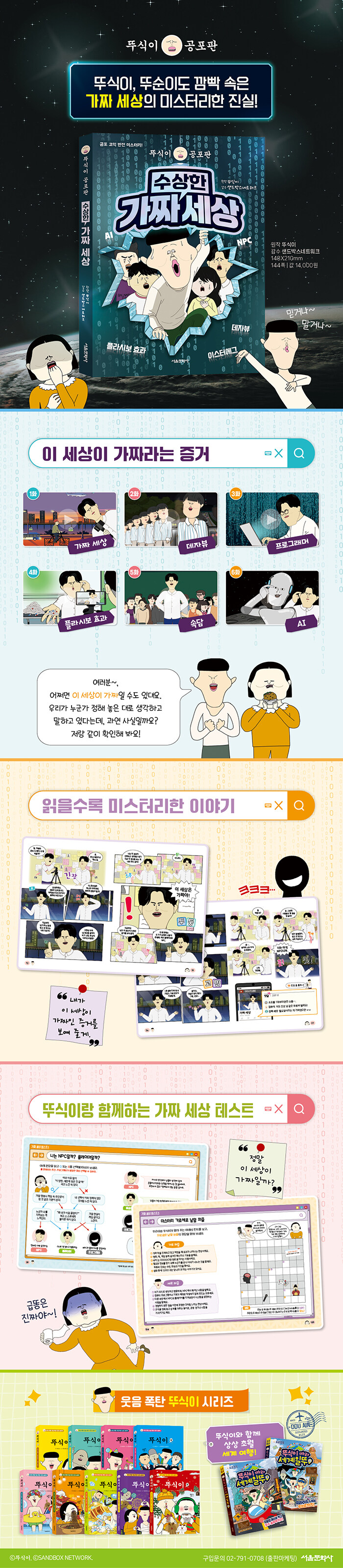 가짜 세상의 미스터리한 진실은?『뚜식이 공포판 수상한 가짜 세상』은 유튜브 <뚜식이> 채널의 인기 영상인 ‘가짜 세상’을 만화로 재구성한 책입니다.