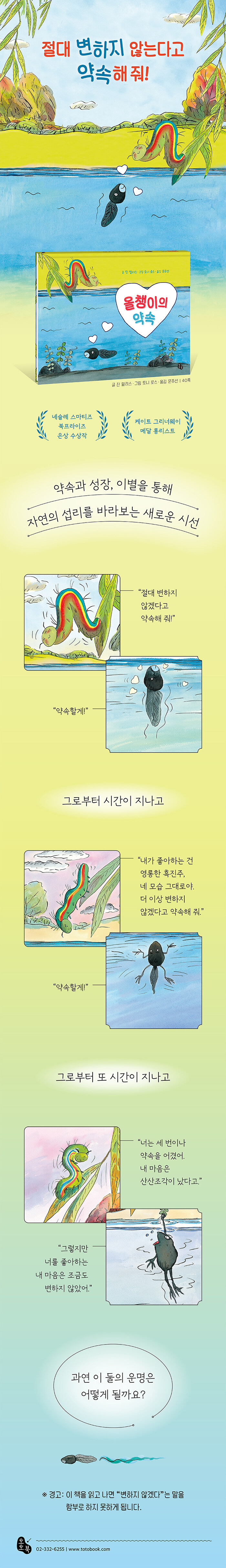 ‘네슬레 스마티즈 북프라이즈 은상’과 ‘케이트 그리너웨이 메달 롱리스트’를 수상한 『올챙이의 약속』은 시적인 문장과 유머러스한 대화, 섬세한 수채화의 붓 터치로 자연의 변화와 성장의 혹독함을 유머러스하게 풀어낸다. 변할 수밖에 없는 자연현상 속에서도 불변의 사랑을 갈구하는 애벌레와 올챙이의 이야기로 생태계 속성을 한눈에 들여다볼 수 있다.