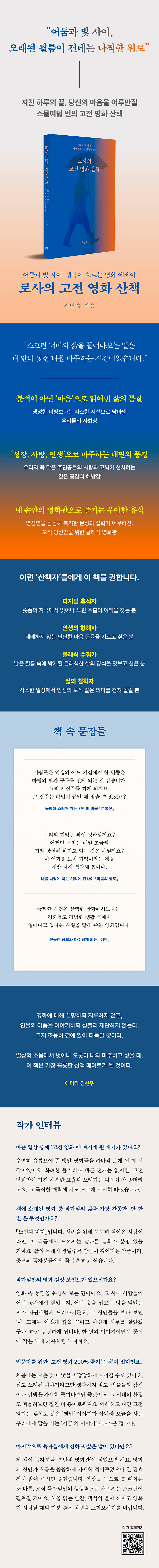 당신의 일상을 낭만으로 채워줄 선물 같은 산책의 시간『로사의 고전 영화 산책』은 스크린 속 박제된 명작들을 끄집어내어, 지금 우리의 삶과 연결한다. 영화의 시대적 배경을 설명하지만 교과서처럼 딱딱하지 않고, 명대사를 인용하지만 가르치려 들지 않는다. 「욕망이라는 이름의 전차」의 균열난 관계, 「갈채」의 좌절과 재기, 「25시」의 전쟁이 남긴 파괴, 「검은 수선화」의 신앙과 욕망의 대비, 「길」의 구원, 「노인과 바다」의 존엄, 「레베카」의 기억과 질투까지, 작품 속에 담긴 감정의 결을 따라가며 오늘의 삶에 필요한 질문들을 끌어낸다. 단순히 장면을 설명하는 데 머물지 않고, 영화의 맥락과 시대적 배경을 풀어내어 오늘날 독자의 삶과 맞닿게 한다. 각 장은 감상과 해석 사이의 간극을 자연스럽게 메운다. 영화의 시대와 배경을 과장 없이 짚고, 장면과 대사를 현재의 언어로 다듬어 독자 스스로 결론에 닿도록 돕는다.