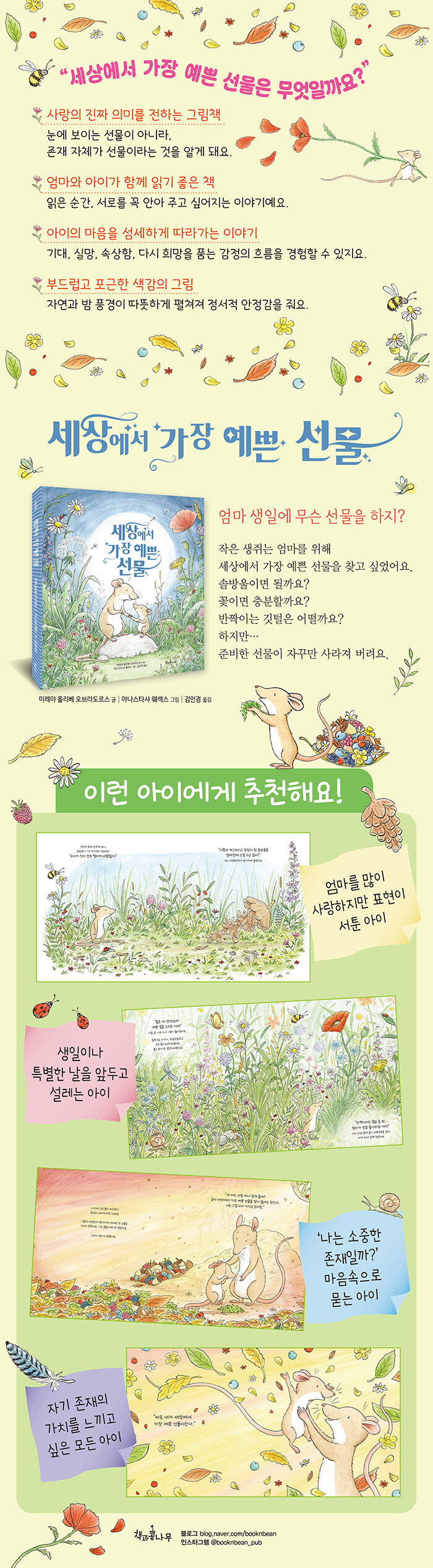 존재 자체를 긍정해 주는 자존감 그림책이야기의 마지막에서 엄마는 말합니다. 굳이 세상에서 가장 예쁜 선물을 찾지 않아도 된다고. 이미 그것을 가지고 있다고. 그리고 그 선물은 바로 ‘너’라고요.