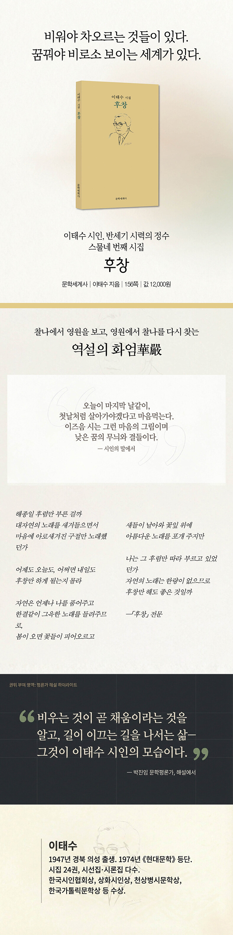 이태수 시인은 자연을 숭상하면서 그 자연 속에 깃들여 꿈꾸는 것이 인생이라는 것을 한결같이 보여왔다. 현실보다는 꿈을, 권력보다는 순응을, 선조적 진보의 시간대보다는 불연속적인 분산의 시간대를 숭상하는 시인이기에 이태수 시인은 자연을 노래하면서도 후창과 후렴이라는 음악의 형식을 시적 이미지로 선택한다.