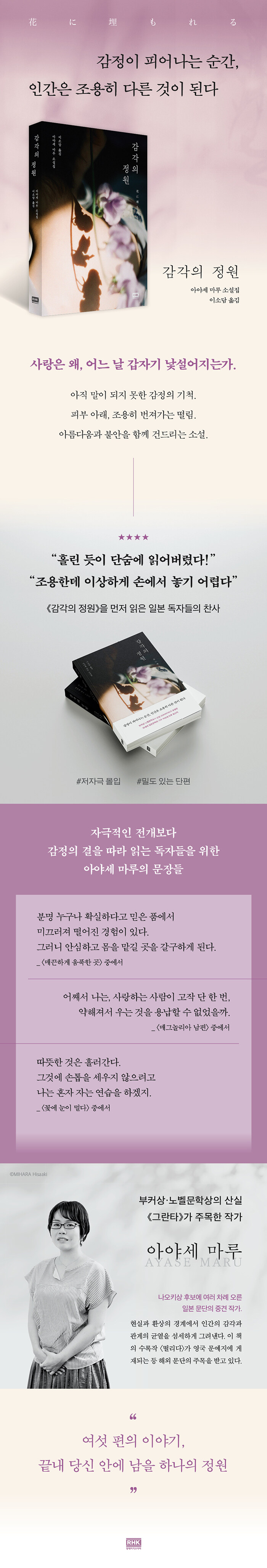 《감각의 정원》에 수록된 단편들은 서로 다른 인물과 상황을 다루지만 결국 하나의 질문으로 모인다. 우리는 관계 안에서 어디까지 자신을 내어줄 수 있는가. 그리고 어디에서 멈춰야 하는가. 작가는 감정을 쉽게 규정하지 않는다. 대신 독자가 그 여백을 스스로 채우도록 남겨둔다. 아야세 마루의 문장은 차분하고 단정하다. 인물의 숨결과 시선, 형용하기 어려운 기척들이 차곡차곡 쌓이며 마음을 건드린다.