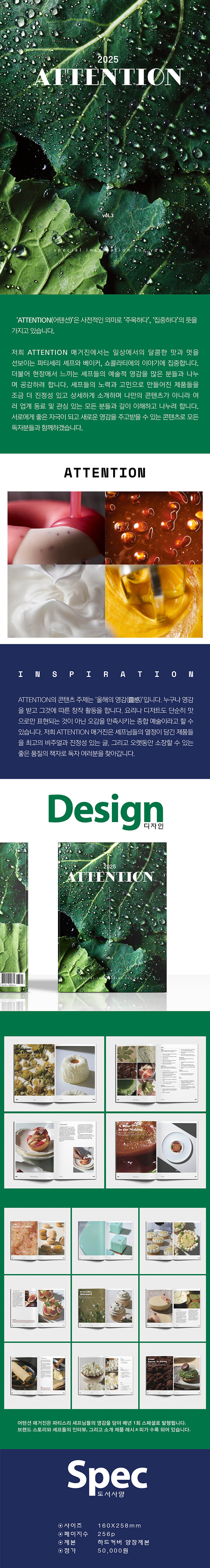 어텐션 매거진에는 2025년 한 해 동안 많은 셰프들이 제품 개발을 하며 느꼈던 영감에 대한 이야기를 수록했습니다. 제품 아이디어에 대한 발상과 표현법, 그리고 제작 공정에 대한 이야기를 담았습니다. 이 한 권의 책으로 모든 내용을 담아낼 수 없지만 한 해 동안 느꼈던 셰프들의 생각과 평소에 소통하고 싶었던 이야기를 만나볼 수 있습니다. 여기에 제품의 레시피도 수록해 하나의 제품이 얼마나 많은 수고스러움과 노력으로 탄생하는지를 많은 독자 여러분들과 깊이 이해하고 공감하려 합니다.