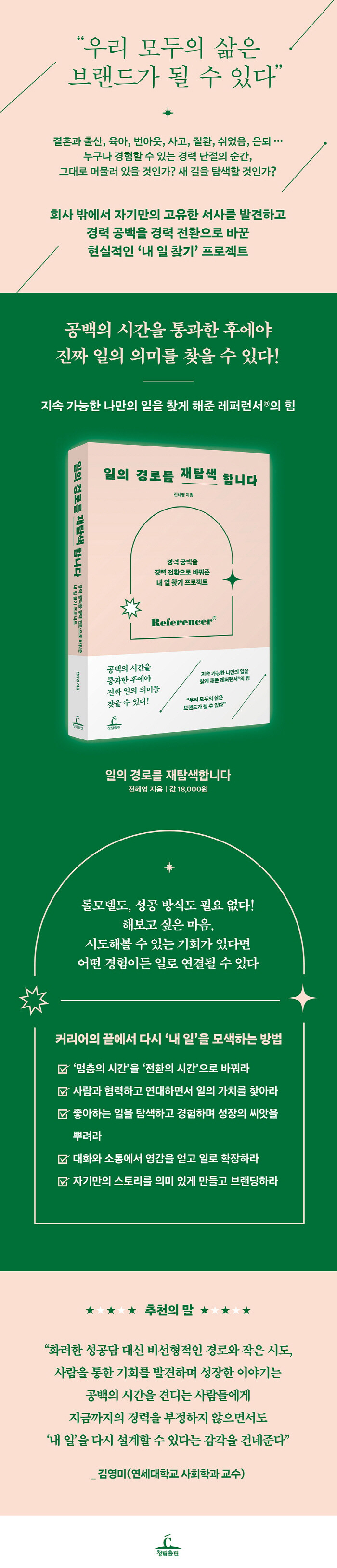 이제 우리의 커리어에는 다른 문법이 필요하다. 해보고 싶은 마음, 시도해볼 수 있는 기회가 있다면 어떤 경험이든 다 일로 연결될 수 있다. 자신의 성장을 고민하고 일과 삶의 확장성을 모색하는 사람에게 이 책은 “무슨 일을 하든 다 괜찮다”는 희망과 용기를 준다. 작지만 선명한, 자신만의 고유한 서사를 탐색하고 발견한 레퍼런서®의 이야기에서 ‘지속 가능한 내 일 찾기’의 열쇠를 발견할 수 있을 것이다.