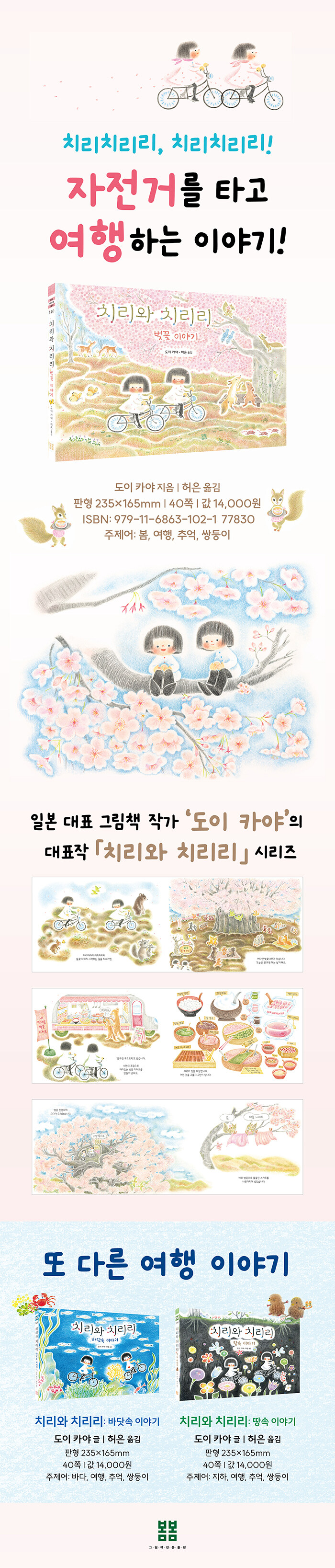 이 시리즈는 치리와 치리리가 자전거를 타고 가면서 신비하고 재미있는 체험을 하는 이야기입니다. 이번 “벚꽃 이야기”에서는 자전거를 타고 벚꽃나무를 여행하면서 신기한 디저트를 먹고, 벚꽃과 관련된 다양한 체험을 하는 이야기가 담겨 있습니다. 벚꽃이 들어간 아이스크림 소다, 벚꽃 앙금이 들어간 단팥죽처럼 먹는다고 상상해 보면 너무나도 환상적인 맛일 것 같은 음식들, 진짜로 있다면 꼭 체험해 보고 싶은 벚꽃 살롱까지……. 도이 카야 작가는 색연필 그림으로 아기자기한 디테일과 신비스럽고 환상적인 분위기를 잘 살렸습니다. 새로운 계절이 시작하는 지금, 치리, 치리리와 함께 벚꽃나무 세상 속으로 떠나 볼까요?