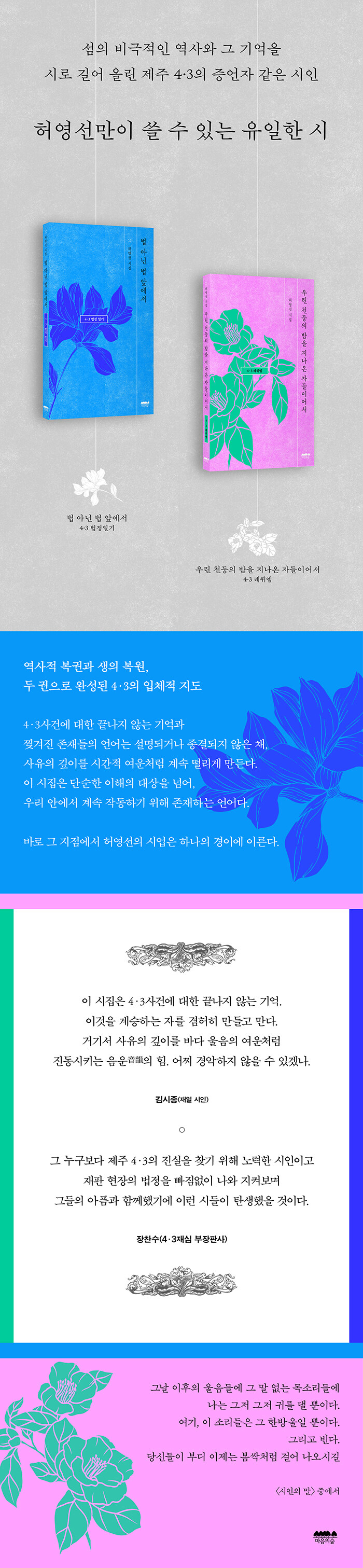 ▶ 참혹한 겨울을 살아낸 이들에게 건네는 따스한 별빛 같은 문장이번 시집의 탁월함은 4·3을 노골적인 단정이나 설명으로 종결시키지 않는다는 데 있다. 찢겨진 존재들의 언어는 종결되지 않은 채 시간적 여운으로 독자에게 전달된다. 이해되기 위해 존재하는 것이 아니라 우리 안에서 계속 작동하기 위해 존재하는 허영선의 언어는, 독자가 지닌 해석의 편향을 흔들며 4·3을 다시 사유하게 만든다.