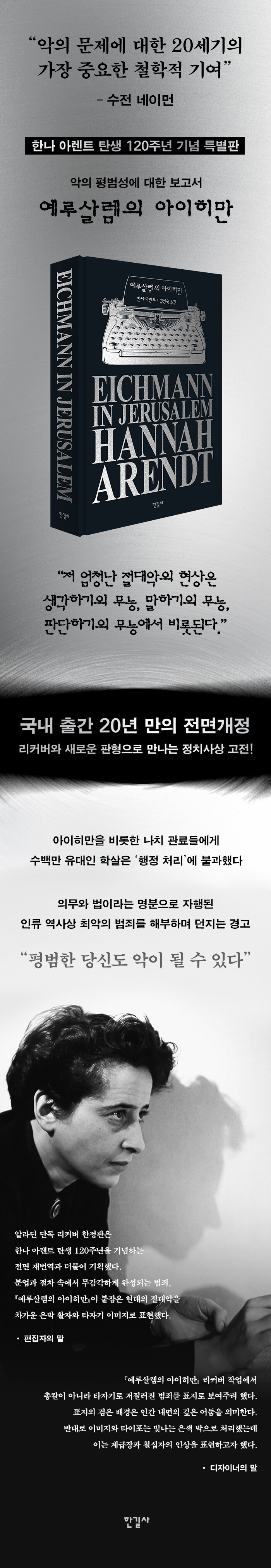 아돌프 아이히만은 나치 친위대에서 유대인 강제이송과 학살의 핵심 실무를 담당했다. 세상은 아이히만이 증오에 빠지고 피에 굶주린 악마일 것이라고 상상했다. 그러나 한나 아렌트가 법정에서 마주한 아이히만은 나치 광신자도, 유대인 혐오자도 아니었다.
