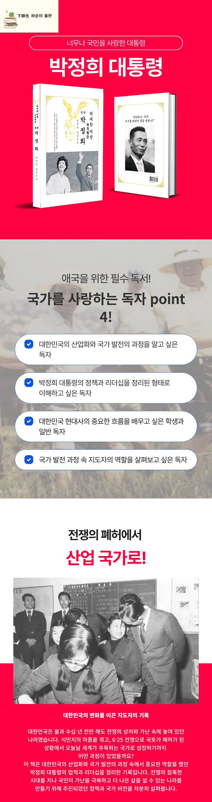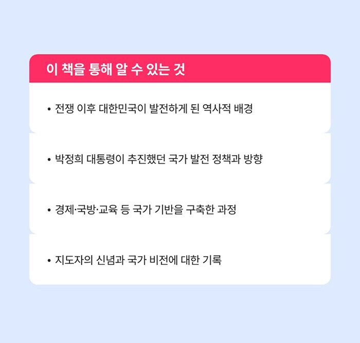 박정희 대통령의 업적을 정리했다. 1장 '혁명과 조국 근대화', 2장 '경제도약과 자주국방', 3장 '교육과 민족중흥·호국'으로 구성되었다.
