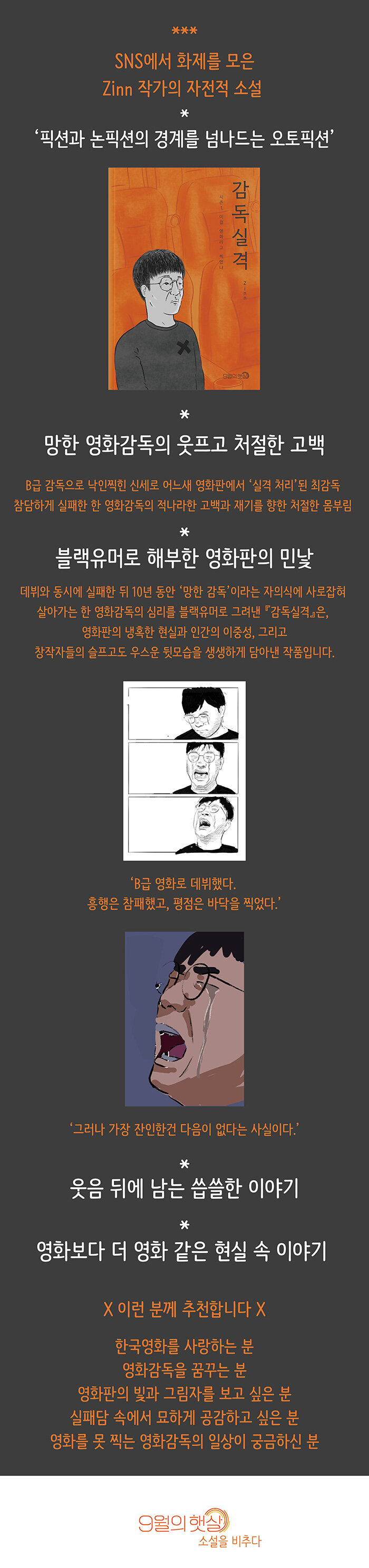 Zinn 작가의 자전적 소설로, SNS 에 발표해 꾸준히 화제를 모으고 있는 연작 소설이다. 실패한 영화감독의 처절하면서도 웃픈 현실을 자조적이면서도 블랙코미디적 서사로 풀어낸 작품으로, 쉽고 유머러스한 문체와 영화계를 배경으로 한 생생한 에피소드를 통해 창작자의 욕망과 허영, 그리고 영화계의 아이러니를 현실감 있게 그려내며 많은 독자들의 공감을 얻고 있다.