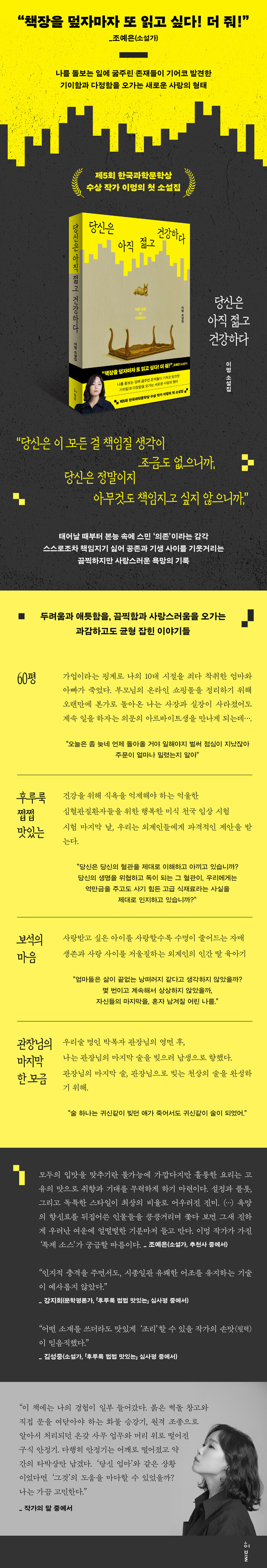 귀신과 곤충, 외계인 등 자칫 과하게 느껴질 수 있는 비인간들은 한국이라는 문화적 배경과 작가의 탁월한 필력을 통해 생동감을 얻는다. 인간과 비인간 사이의 관계를 역전시키면서 자연스럽게 ‘역지사지의 감각’을 느끼게 하는 것이다. 이처럼 『당신은 아직 젊고 건강하다』는 장르적 재미로 뛰어난 흡입력을 지님과 동시에 오늘날 우리가 직면한 현실을 외면하지 않고 어떻게 기억하며 내재화할지 묻는 독특한 깊이를 지닌 소설집이다.