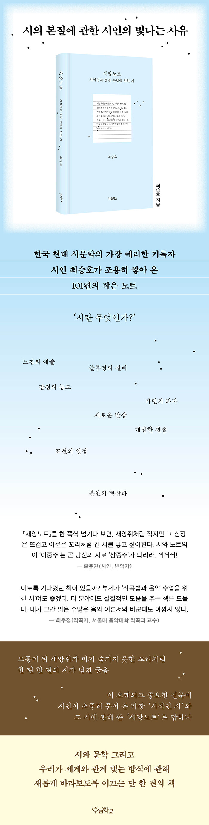 각 장에서 다루는 시의 요소에 관해 먼저 사유했던 시인, 화가, 철학자 등 예술가와 문학가의 생각을 집약한 작품과 문장이 풍부하게 인용되어 머리를 깨우고, 본문에서 최승호 시인이 해석하는 시의 요소에 대해 충분히 이해하며 시작법을 익힌 뒤, 문장 수업을 위한 시와 ‘새앙노트’를 차례로 읽으며 시인처럼 시를 읽고, 시인처럼 시를 쓰는 방법을 자연스럽게 터득하게 된다.