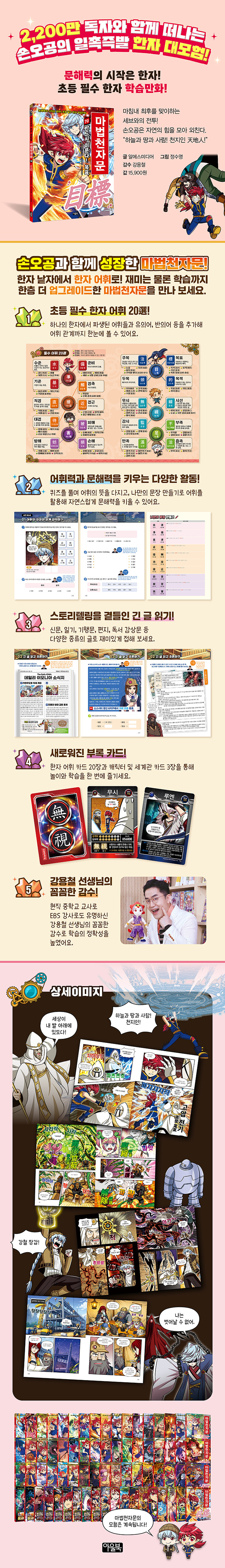 (1) 대한민국 어린이들의 필독서이자 스토리로 즐기는 국내 유일의 한자 학습만화 『마법천자문』!2,200만 독자가 선택한 마법천자문은 2003년 첫 출간된 이후, 지난 21년간 한자 학습의 열풍을 일으키며 어린이들에게 큰 사랑을 받아 왔습니다. 『마법천자문』1~53권은 각 권 별로 등장하는 신규 한자 20자를 만화 속 이야기에 나오는 한자마법을 통해 재미있게 익힐 수 있도록 구성했습니다. 권수를 더해 갈수록 저절로 암기되는 한자의 양은 늘어나고, 한자 낱자 두 개를 붙여 만드는 단어마법과 한 개의 낱자를 다양한 낱자들과 합쳐 확장하는 단어확장마법까지 읽고 나면 한자 능력이 부쩍 향상됩니다.