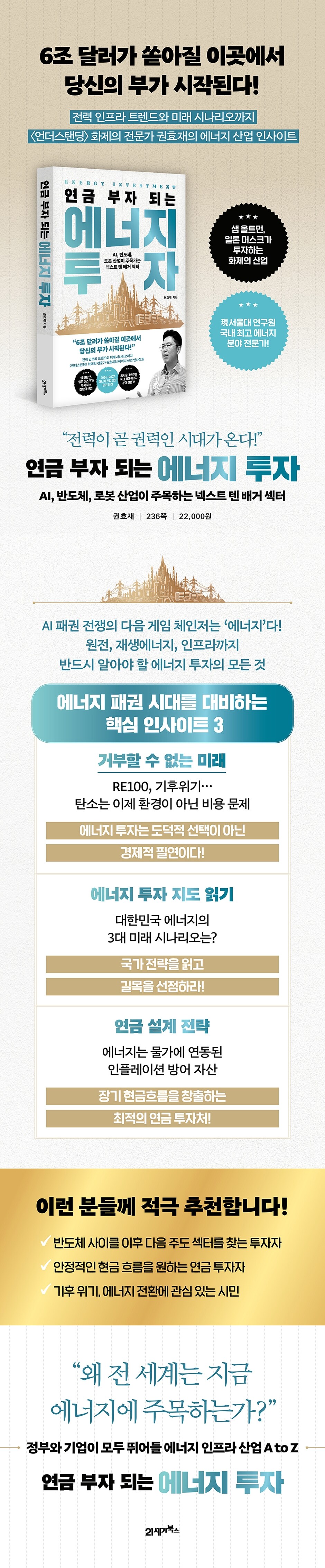 에너지 전환은 이미 시작됐다. 질문은 이것뿐이다. 당신은 단기적 뉴스에 반응하는 투자자인가, 아니면 장기적 구조 변화를 선점하는 투자자인가. 『연금 부자 되는 에너지 투자』는 후자를 선택하고 원하는 투자자, 다음 20년의 자본 이동을 이해하고 싶은 사람에게 가장 현실적인 전략서가 될 것이다.