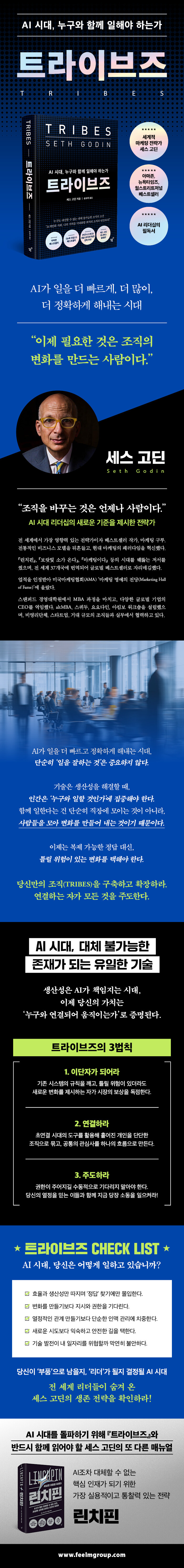 ★ 세스 고딘 유니버스 결정판!세계적인 마케팅 전략가 세스 고딘은 오랫동안 일과 조직, 그리고 리더십의 미래를 예측해 왔다. 『린치핀』에서 개인이 조직 안에서 대체될 수 없는 존재가 되는 방법을 이야기했다면, 『트라이브즈』에서는 한 걸음 더 나아가 사람들이 어떻게 서로 연결되고, 어떤 방식으로 새로운 조직과 움직임을 만들어 내는지를 탐구한다. 『트라이브즈』에서 세스 고딘이 말하는 ‘부족(Tribes)’은 단순한 조직이나 커뮤니티가 아니다. 공통의 가치와 믿음을 중심으로 서로 연결된 사람들의 집단, 그리고 그 연결을 통해 새로운 변화를 만들어 내는 공동체를 의미한다. 그는 인터넷과 소셜 네트워크가 등장한 이후 세상의 구조가 크게 바뀌었다고 말한다. 과거에는 대규모 조직이나 제도 속에서만 영향력을 행사할 수 있었지만, 이제는 한 사람의 아이디어와 메시지가 사람들을 연결하고 새로운 흐름을 만드는 시대가 되었기 때문이다. 이때 필요한 것은 권위적인 관리자나 지시형 리더가 아니라, 사람들을 모으고 방향을 제시하는 리더다.