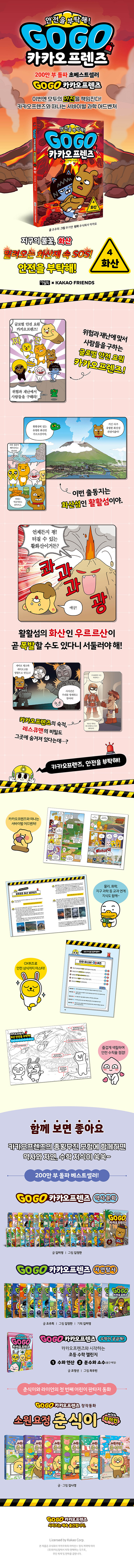 카카오프렌즈가 네 번째 안전 임무로 화산 분화 현장에 출동한다. 누적 판매 200만 부를 돌파한 초베스트셀러 「Go Go 카카오프렌즈」의 새 시리즈 「안전을 부탁해!」는 지진, 태풍, 폭설에 이어 화산을 다루며, 새로운 시대에 필요한 안전 교육을 어린이의 눈높이에서 풀어낸 서바이벌 과학 학습만화다.