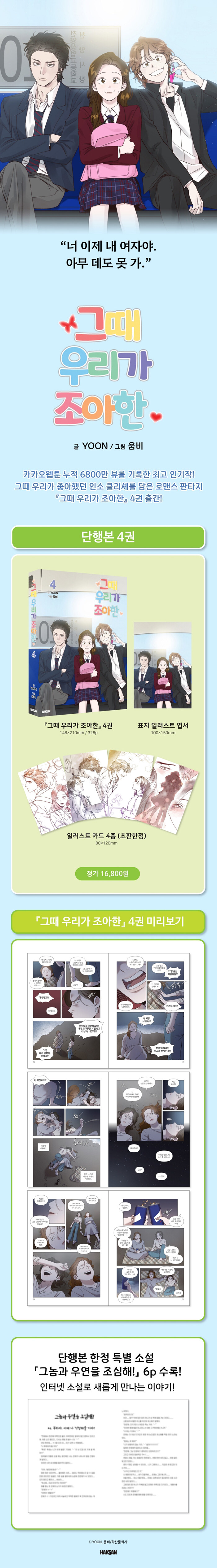 몰입력 있는 이야기를 전개하는 YOON 작가와 따뜻한 그림체로 이야기에 색을 입히는 움비 작가가 선사하는 <그때 우리가 조아한>이 드디어 시즌 1을 마무리하는 단행본 4권으로 출간되었다. 카카오웹툰 누적 6800만 뷰를 기록한 인기작으로, 지금까지도 많은 사랑을 받는 이 작품은 인터넷 소설과 현실 세계를 넘나들며 사랑과 성장을 그린다. 그 시절 특유의 클리셰를 듬뿍 느낄 수 있는 로맨스 이야기로 독자들에게 설렘을 전한다.